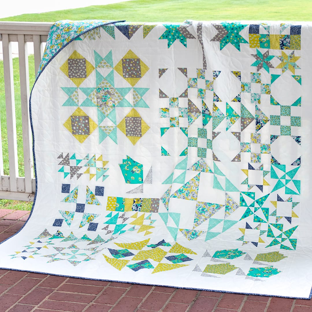 We’re sewing with the Summer Sweet collection by Sherri and Chelsi for Moda Fabrics. To make a quilt just like this one, you’ll need the Bloom-Topia Quilt Kit and Bloom-Topia Specialty Pieced Backing Set, available only at Fat Quarter Shop. If you’re sewing with something different, here are the fabric requirements.