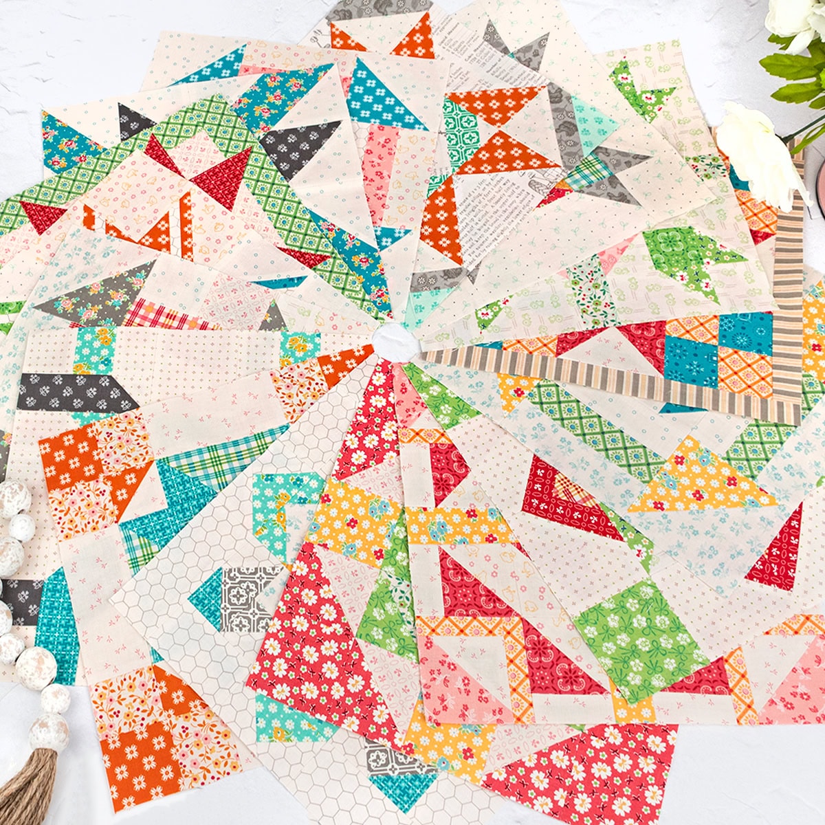 The start of the 2026 RBD Block Challenge is right around the corner, and this year, Lori Holt colored the quilt in her new Farmer’s Daughter collection with Riley Blake Designs. The color palette of the Farmer’s Daughter collection gives a wonderfully scrappy feel to this sampler quilt, and the greens and blues in the sashing and binding fabrics tie it all together! Every year, the RBD Block Challenge quilt inspires us to learn new techniques, explore new block designs, and connect with the quilting community. Keep reading for all the quilty details!