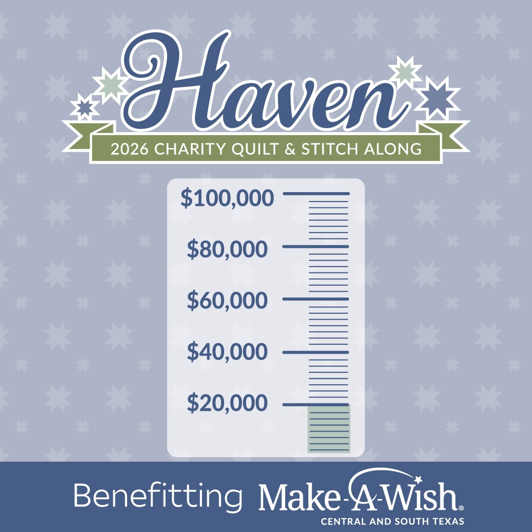 The 2026 Haven Quilt and Stitch Along represents the haven of hope, strength, and courage given to families by the Make-A-Wish Foundation. It isn’t just a wish, it’s the gift of rest, respite, and renewal when they need it the most. We invite you to sew and stitch along with us in June 2026, and we can’t wait to start these two special projects with you this spring!