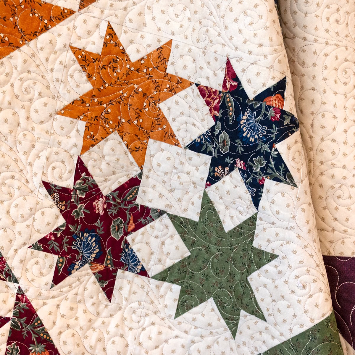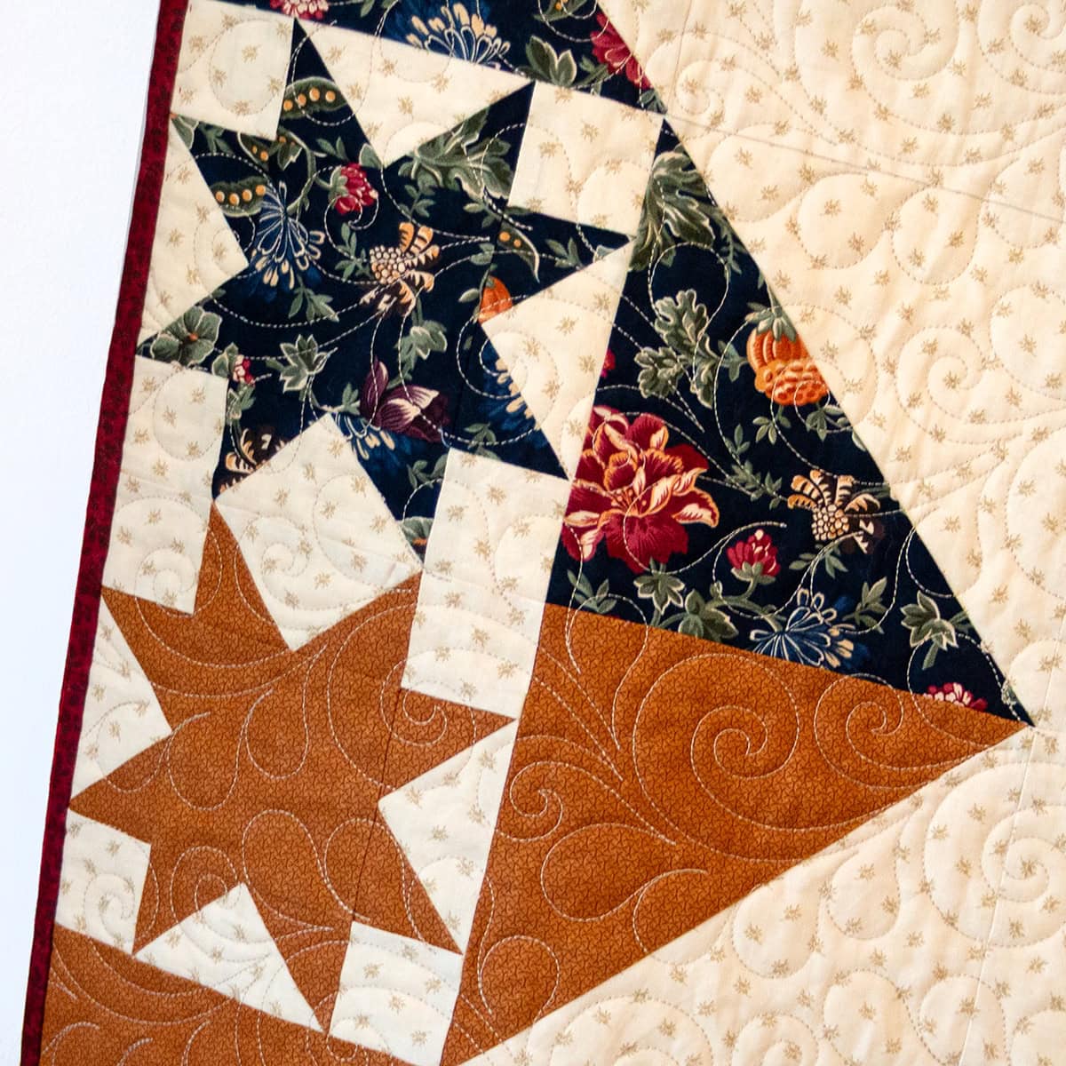 We sewed ours with the Quail Run Collection by Kansas Troubles Quilters for Moda Fabrics, in the Large Lap size and used the recommended 6″ Half Square Triangle Paper and the 1.5″ x 3″ Flying Geese Foundation Paper. The rich colors we know and love from Kansas Troubles Quilters are paired with trailing vines, berries, and geometrics that add the perfect touch of depth and movement to this dynamic quilt pattern!