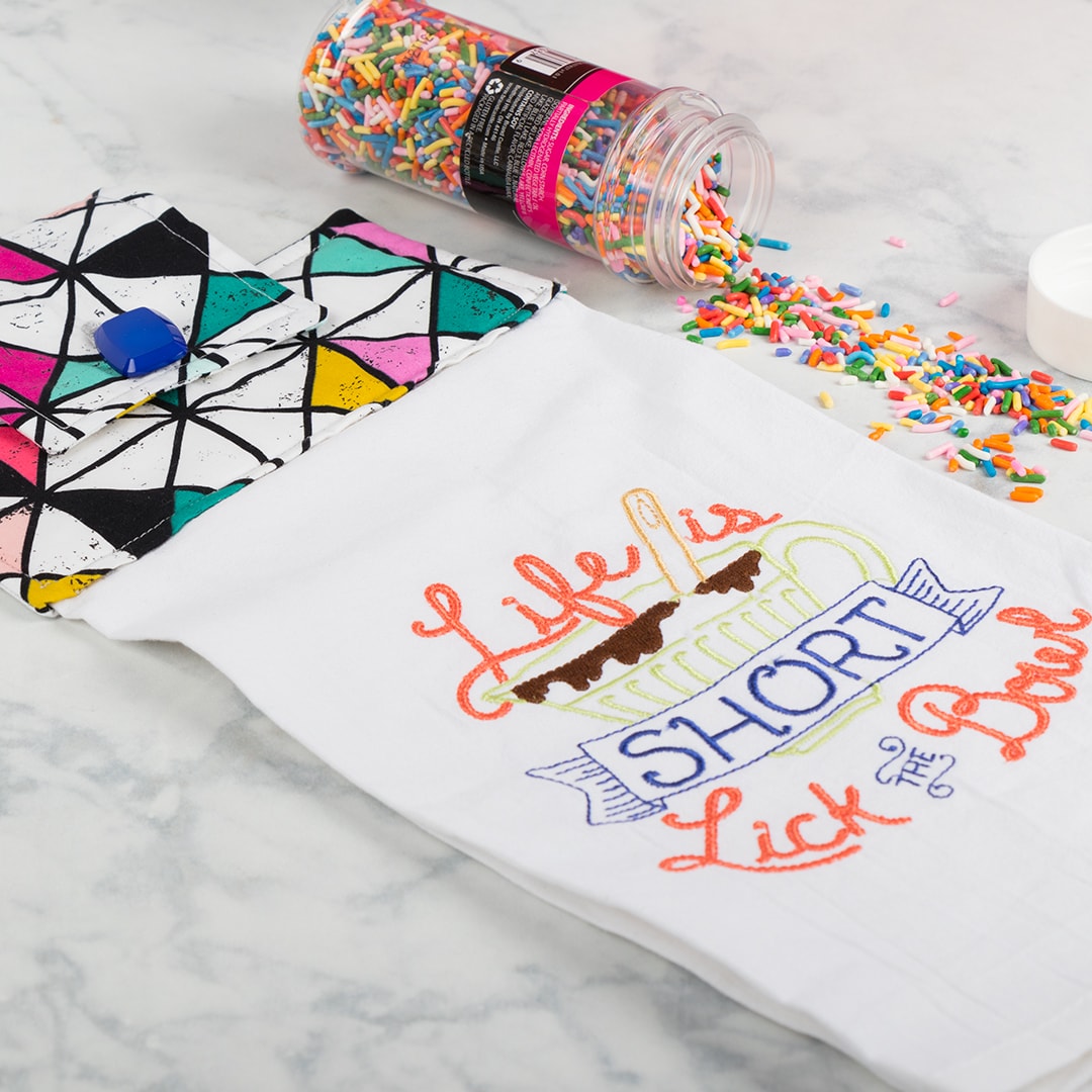 Quilty Staffer Elva made her Milk Cow Kitchen Towel using Grid by Katarina Roccella for Art Gallery Fabrics. She says, “I had fun using an embroidered hand towel, and I think this would be a great housewarming gift!”