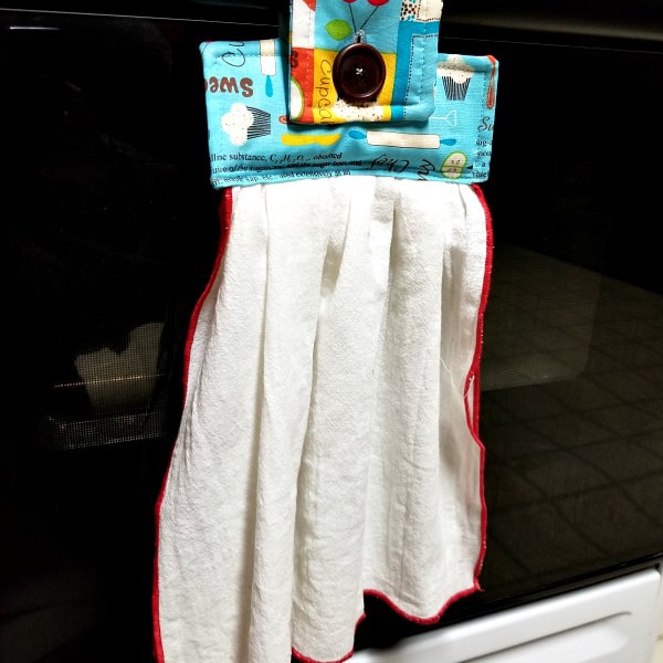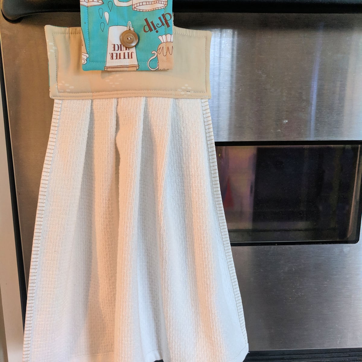 Kristie of Tea Doddles (@teadoddles) made her Milk Cow Kitchen Towel using a fun kitchen print by David Textiles that was in her stash. She says, “I used cotton flour sack towels for this project. They are thinner, so I folded them in half & used basting stitches on each side of the fold to gather the towel in the center. “