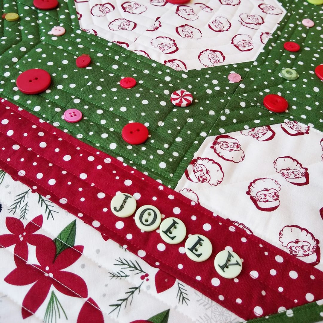 Our quilty friend Pat Sloan has made a bonus project, a wall-hanging pattern! This is such a fun twist on a traditional holiday wreath! Its called Joyful Wreath and Pat has created a FREE tutorial and FREE downloadable pattern just for you! She used October’s button collection and Winterberry by My Mind’s Eye for Riley Blake Designs.