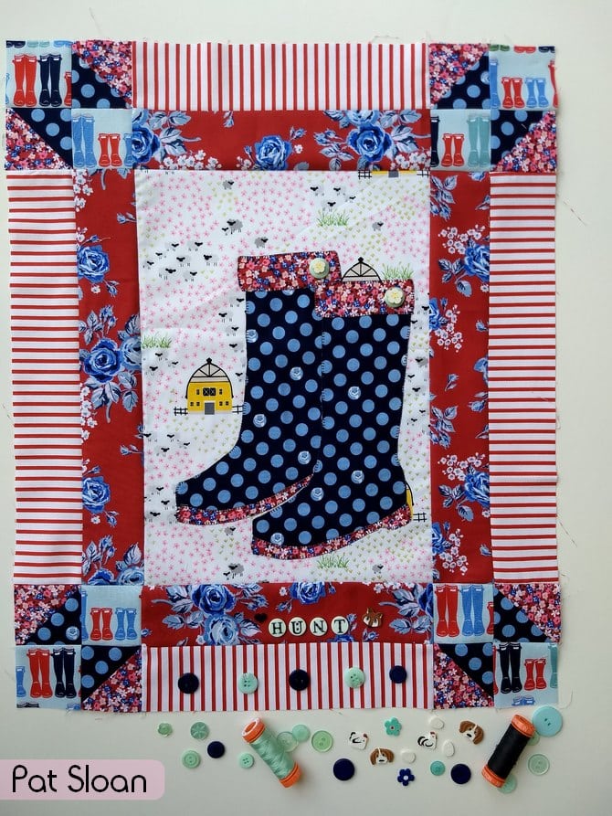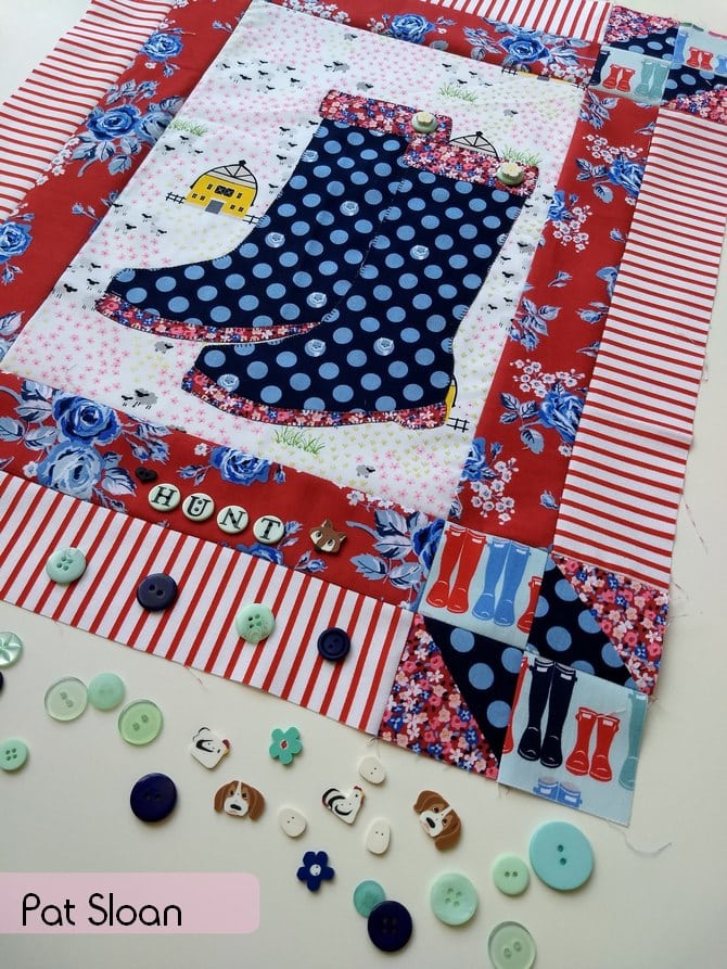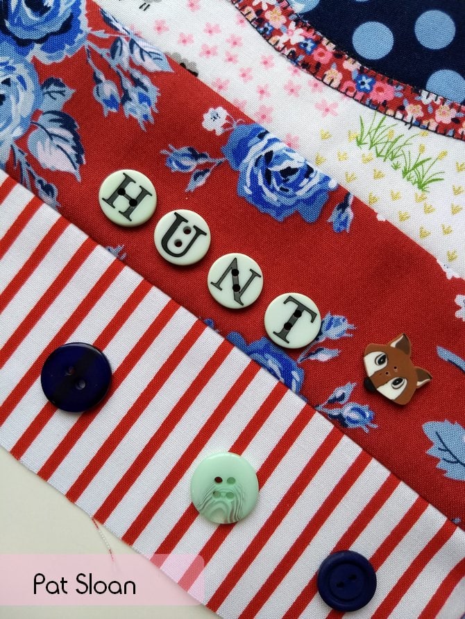 Our quilty friend Pat Sloan has joined us this year to make her version of the project using the buttons. She used last month’s buttons, Hunt Buttons, and Fox Farm by Melissa Mortenson by Riley Blake Design to make this adorable block!
