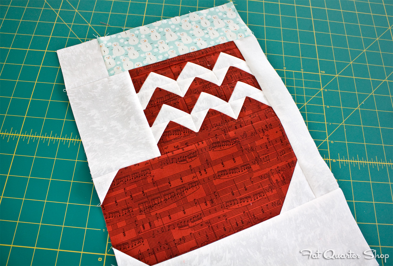For our stocking blocks, we wanted to take the iconic stocking and add our Fat Quarter Shop pizazz. Two rows of chevron decorate each stocking and we added a bold, focal print to the cuff. Our two stockings are made with complimentary colors, red and green, but we are excited to see what colors you choose to use!