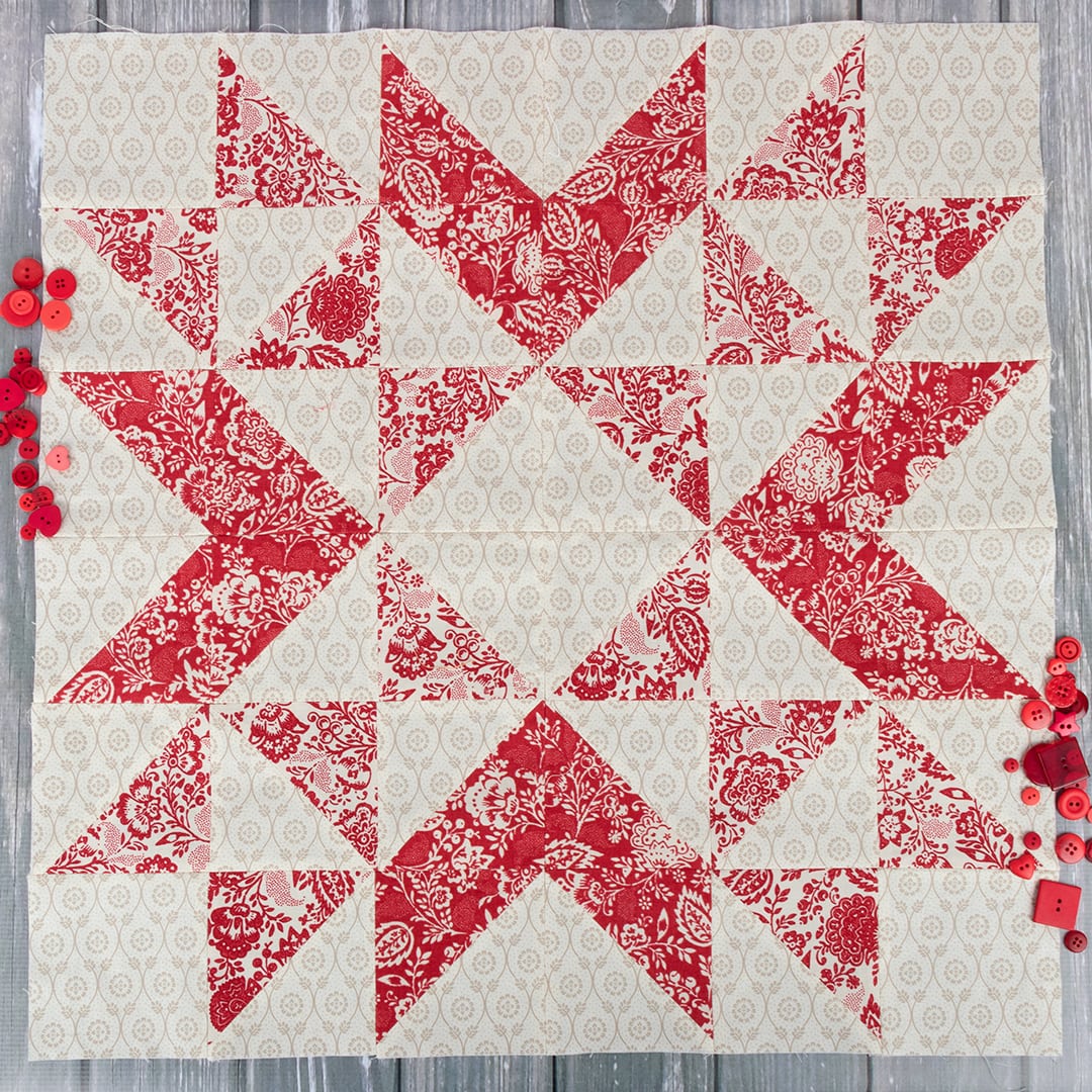 The Sapphire Block is one of our favorites! It packs a big punch with 4″ half-square triangle units. We love it so much that we put it on the cover and made the Sapphire Quilt Kit featuring Sugarcreek by Corey Yoder. This lovely star block quilt is 84.5″ square. With Corey Yoder’s cheerful vintage fabrics, it’s a match made in heaven.