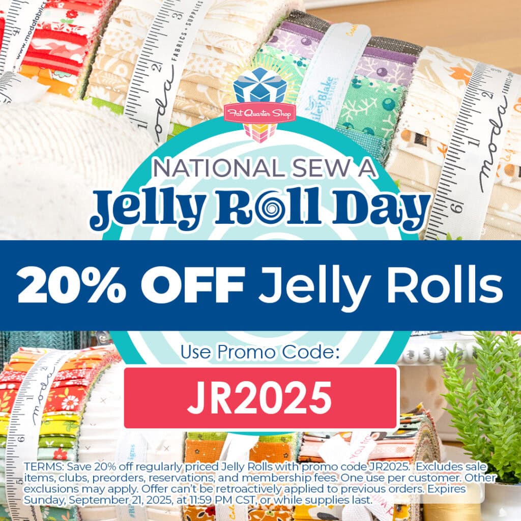 In honor of this quilty holiday, we have a Jelly Roll Day Sale for you! Use coupon code JR25 to save 20% off Jelly Rolls. This coupon is not combinable with other offers. Excludes sale items, reservations, and membership fees. One use per customer. Can not be retroactively applied to previous orders. Other exclusions may apply. Offer expires Sunday, September 21, 2025, at 11:59 PM CST.