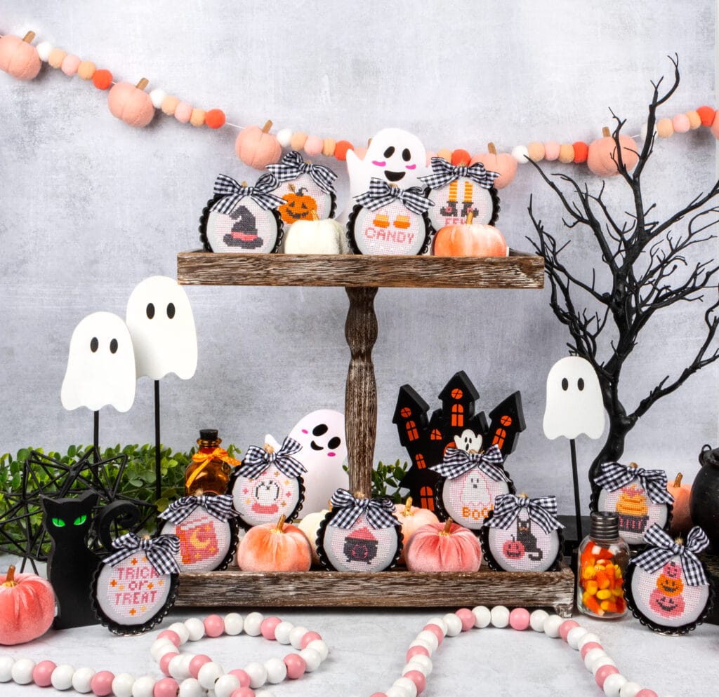 Bewitching stitches abound with the Spooky Cute Cross Stitch Pattern! Finish them as ornaments for a Halloween tree or a spooky cute display like the one shown above, or read the tutorial for all the dreadful details on this pillow finish.