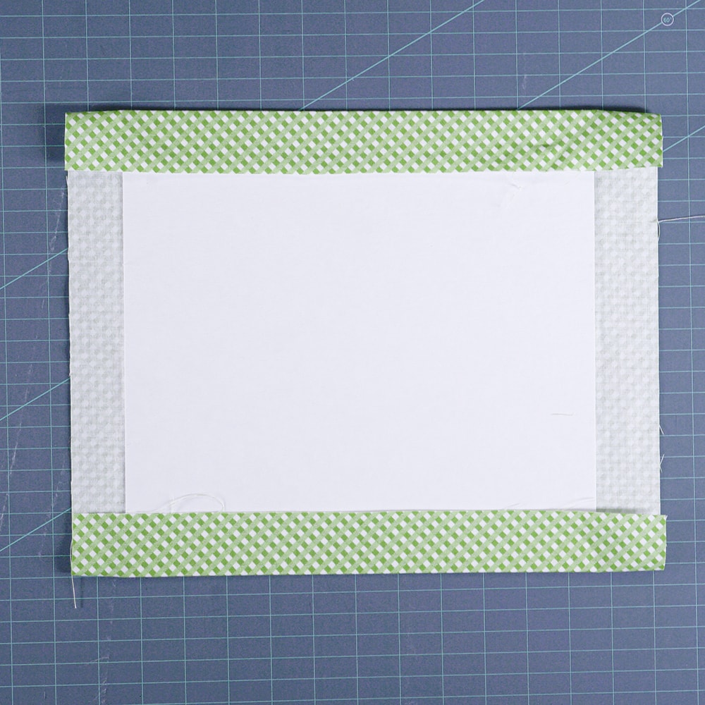 Peel off the liner on the sticky board and place the sticky side to the wrong side of the fabric making sure the gingham is straight. Cut about 1” away from the sticky board. Apply hot glue directly on your sticky board and pull your fabric to the back, finger pressing it down. I recommend starting with the top and bottom, and then repeat on the left and right side.