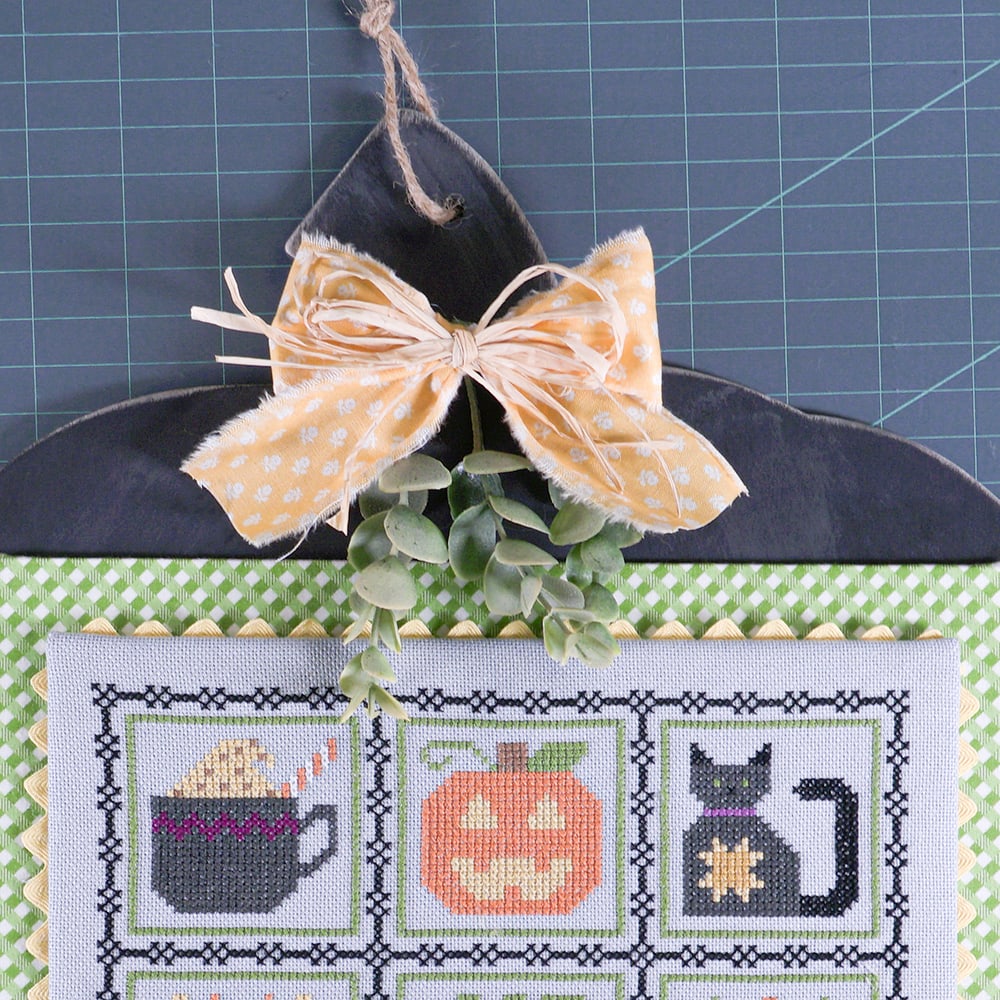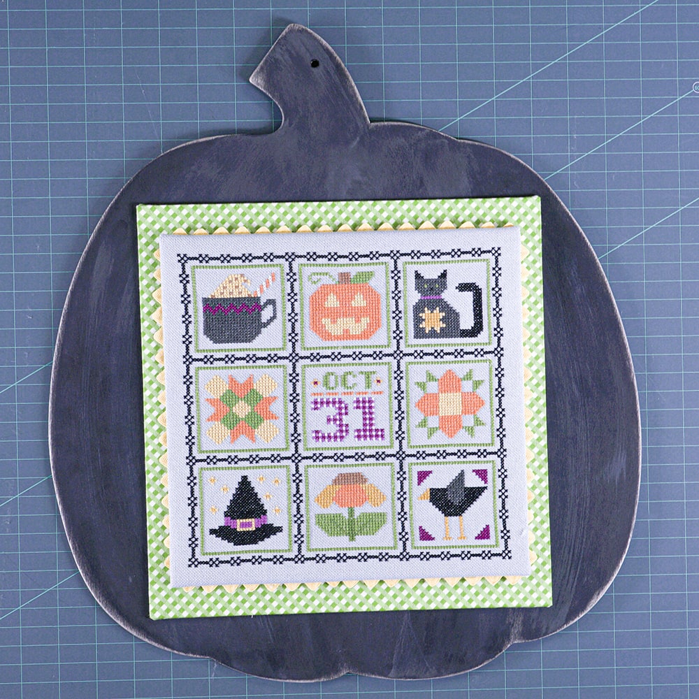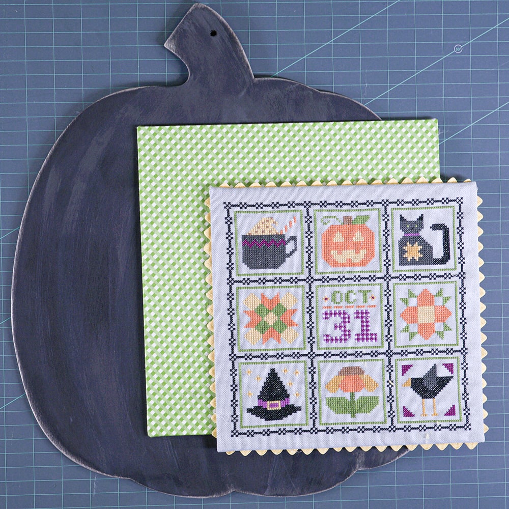 - Lori picked a gingham fabric and she wanted to see the green pop on the pumpkin. She decided to leave 0.75” around all sides of the fabric piece to frame the stitch. To do this, take the measurement (in this case, 9.25” x 9.5”) of the mounted stitch piece and add 0.75” on all sides. Cut the sticky board at 10.75” x 11”.