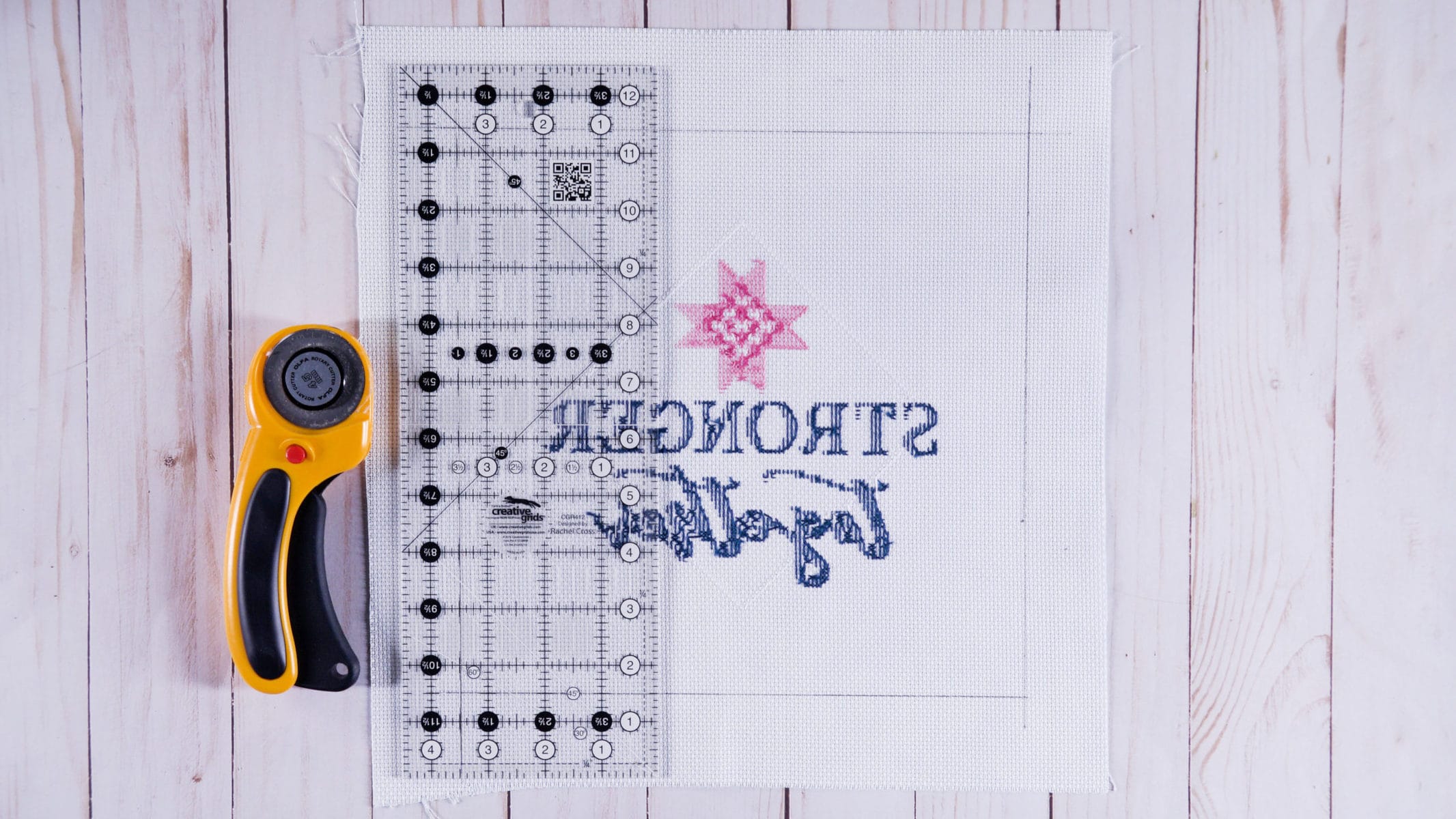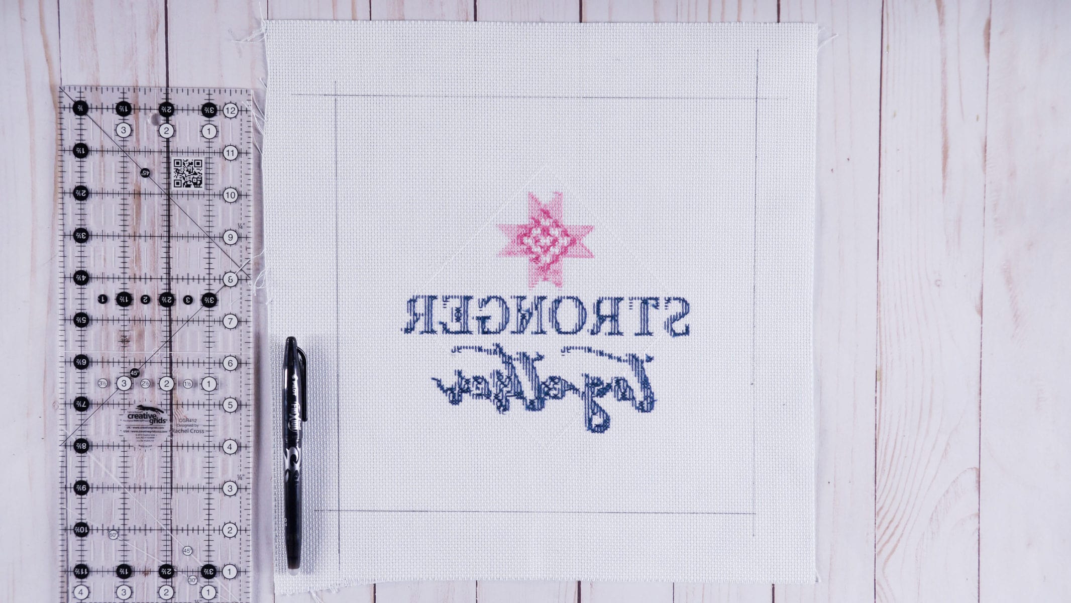4. Lining up your ruler 1.5″ away from your last stitch, draw your lines on the backside of your stitch piece. Repeat on all four sides.