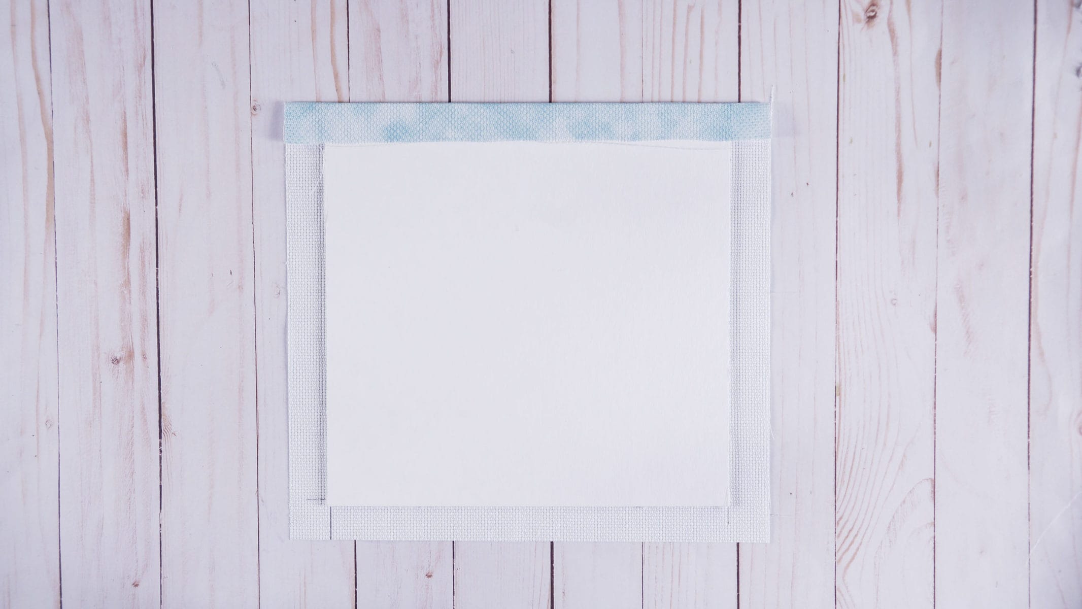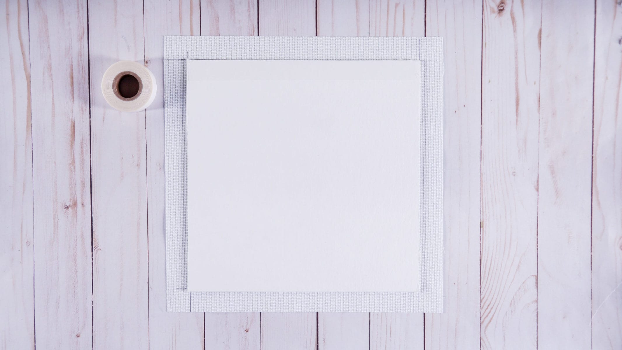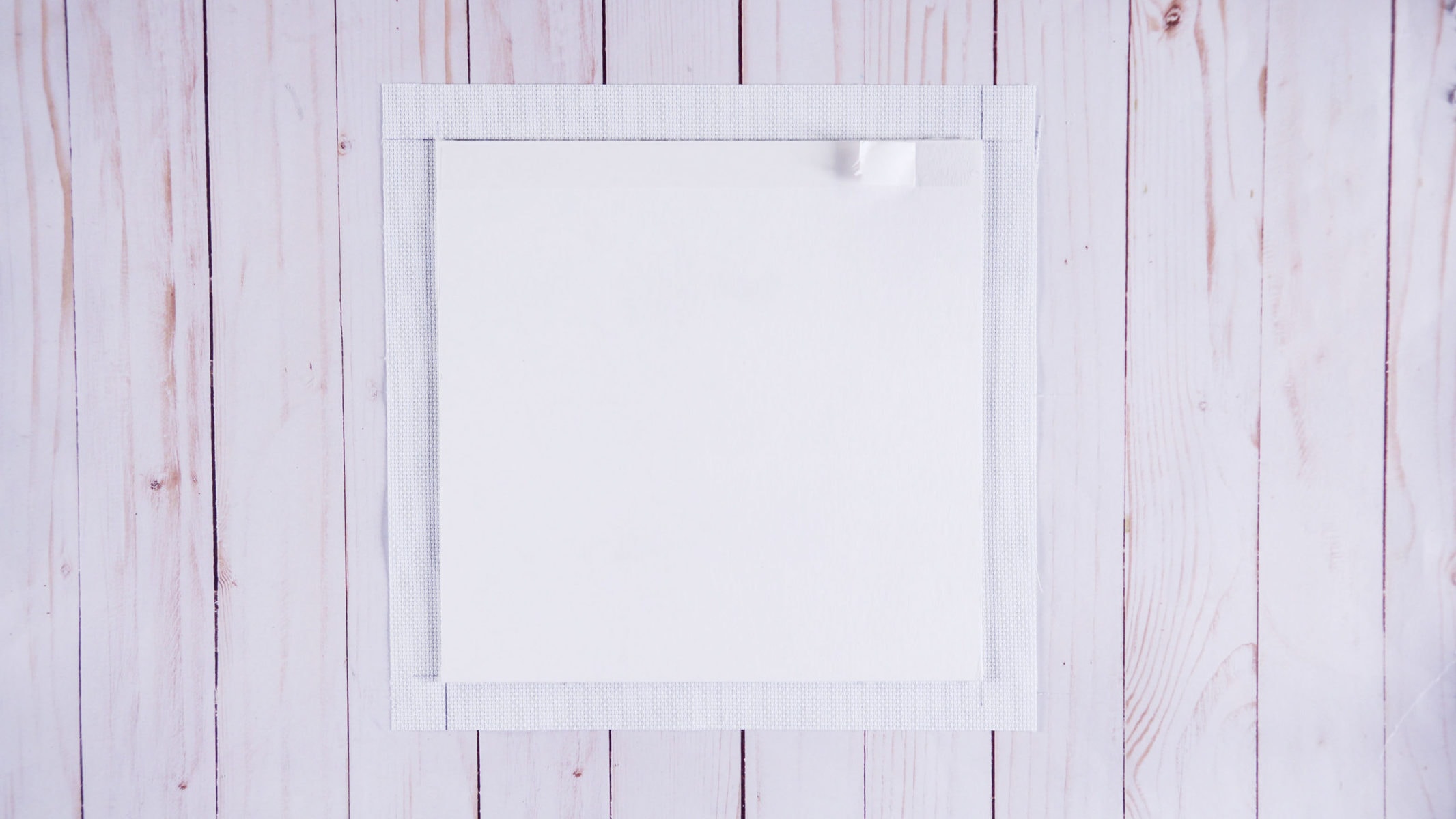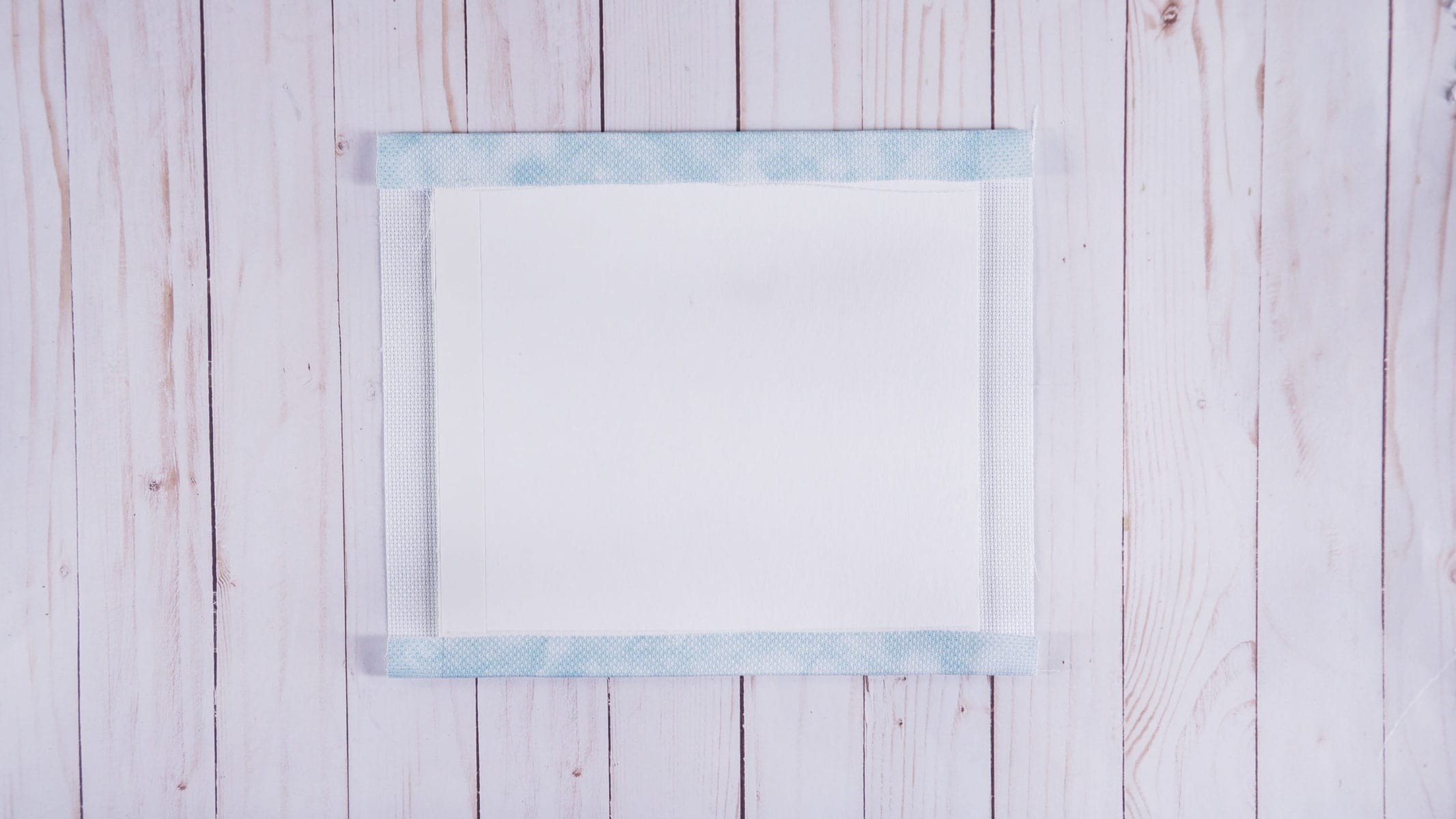 1. I chose a 10” square frame, so you will cut down your sticky board to 10” x 10” to fit the frame. We stitched on Aqua Dyed Effect 14 Count Aida. Your finished size will vary by cloth count.