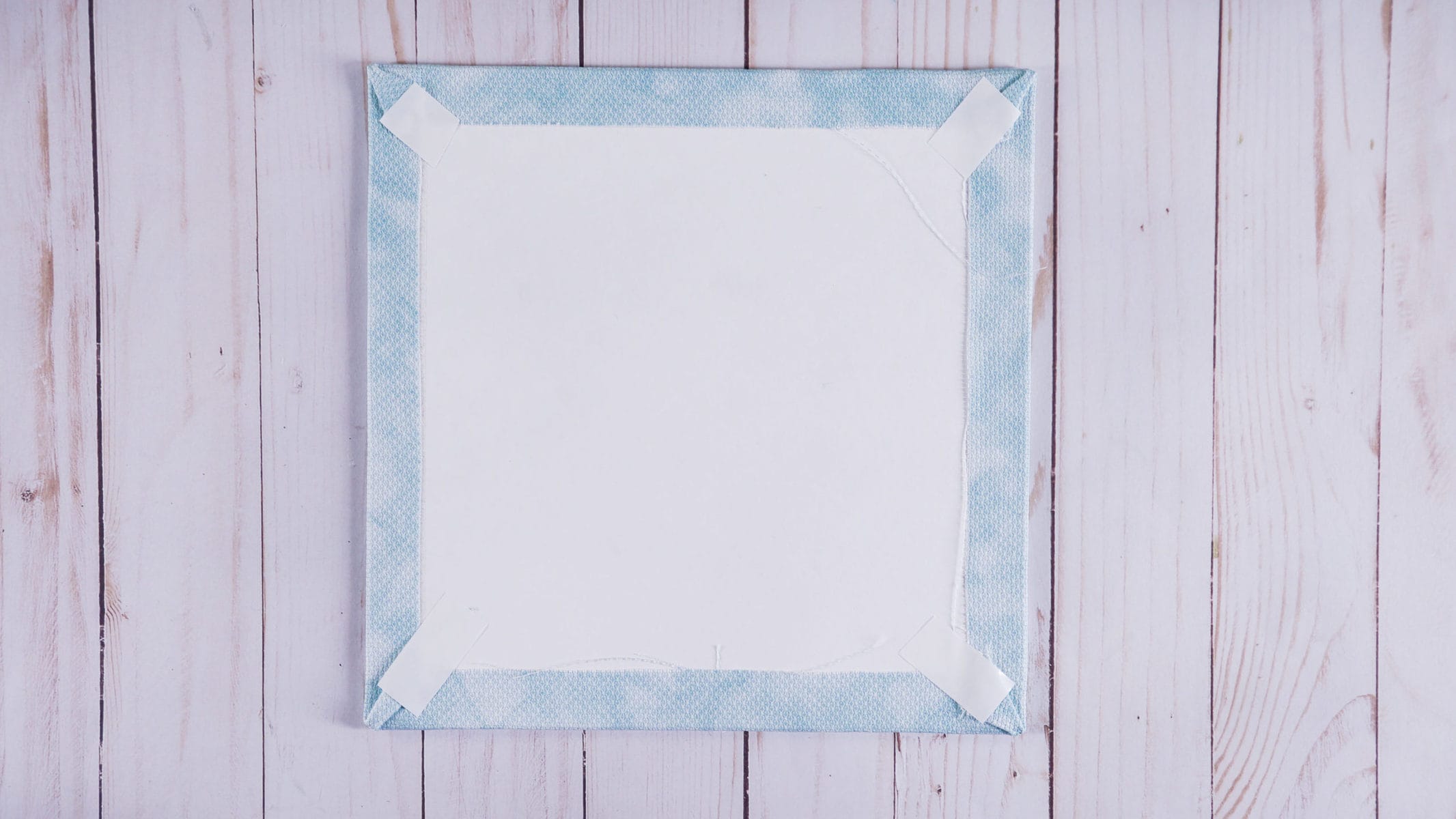 8. Starting on the left, apply It’s Sew Emma Cross Stitch Finishing Tape along the edge of your sticky board and remove the liner. Then pull your fabric, finger pressing it down to your sticky tape. Repeat on the right side leaving all corners open.