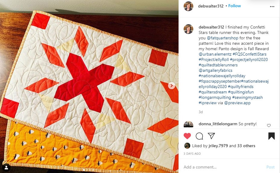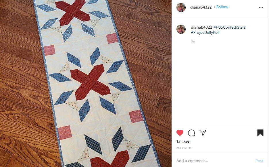- Share a photo of your completed Confetti Stars Tablerunner with #FQSConfettiStars and #ProjectJellyRoll