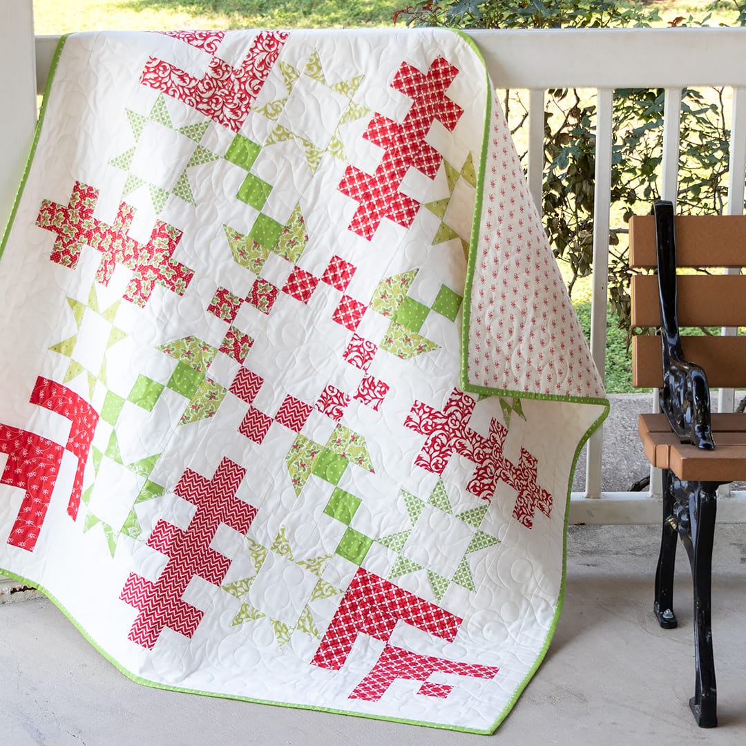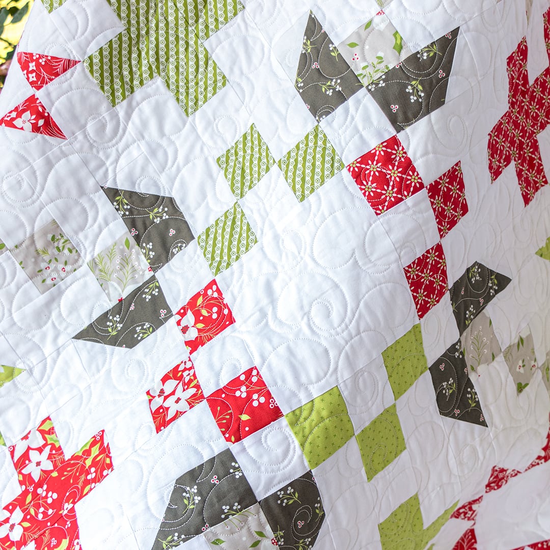 Kimberly shows you how to cut and add borders to finish up the quilt in this video. After putting the quilt top together you can quilt and bind as usual. At just 50.5″ squared, this cute Christmas quilt goes together quickly.