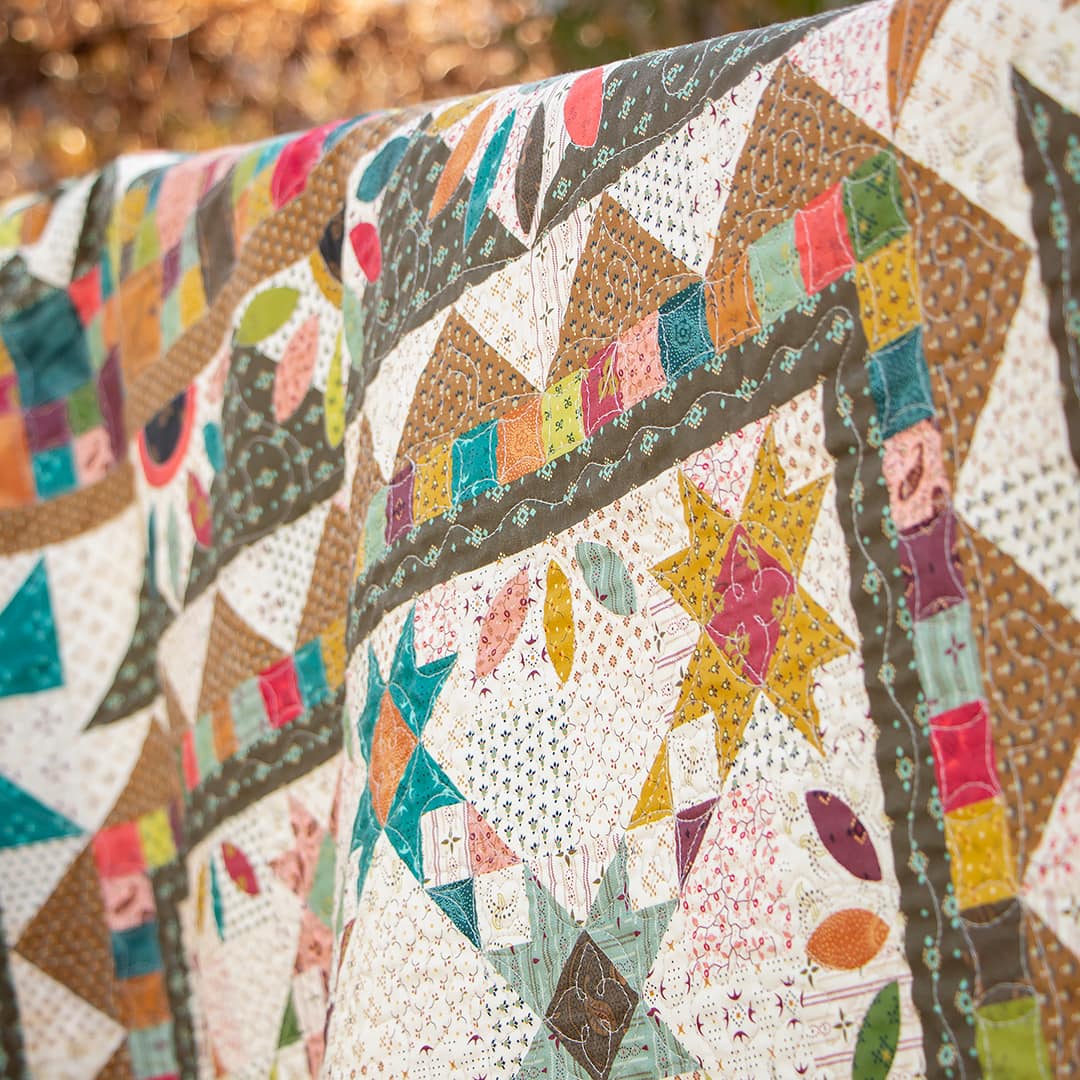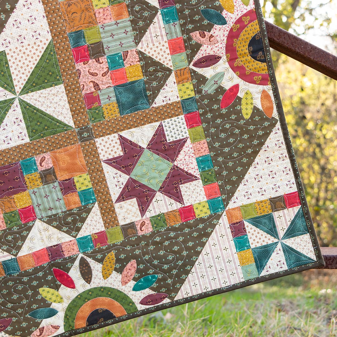 This gorgeous medallion quilt is sewn with Esther’s Heirloom Shirtings by Kim Diehl for Henry Glass Fabrics. You’ll also want to pick up the matching Backing Set to complete your quilt. Here is a closer look at the design!