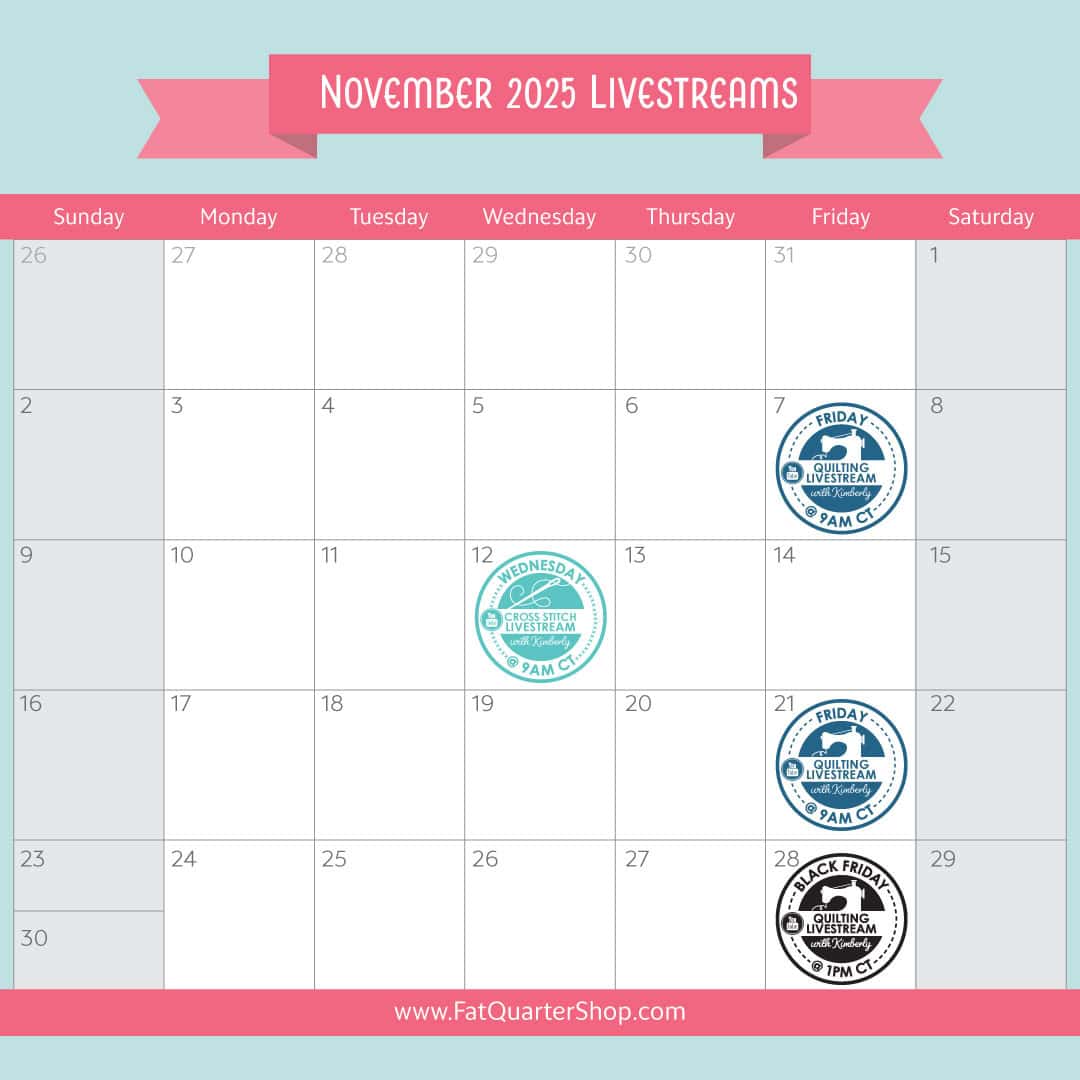 We love spending time with y’all during our Livestreams on the Fat Quarter Shop and Fat Quarter Shop FlossTube channels—it’s the highlight of our week! To make sure you never miss a moment of fun (or a sneak peek or two), we put together a monthly Livestream calendar just for you. Be sure to note that our November 28th Black Friday Livestream starts at 1 PM CST, so set a reminder and join the fun!