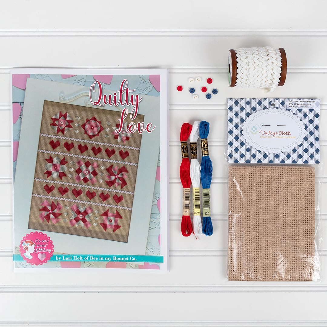 Yes, you can purchase the Quilty Love Pattern, the Aurifil floss, or DMC Floss, the Lori Holt ¹/⁴” Cute Buttons, for embellishments, the Lori Holt Oatmeal 10 Count VintageCloth,, the Cloud Vintage Trim, and Tapestry Needles size 24 or 26, EVERYTHING for this Quilty Love Cross Stitch product and many more* at The Fat Quarter Shop! Good Luck To You!