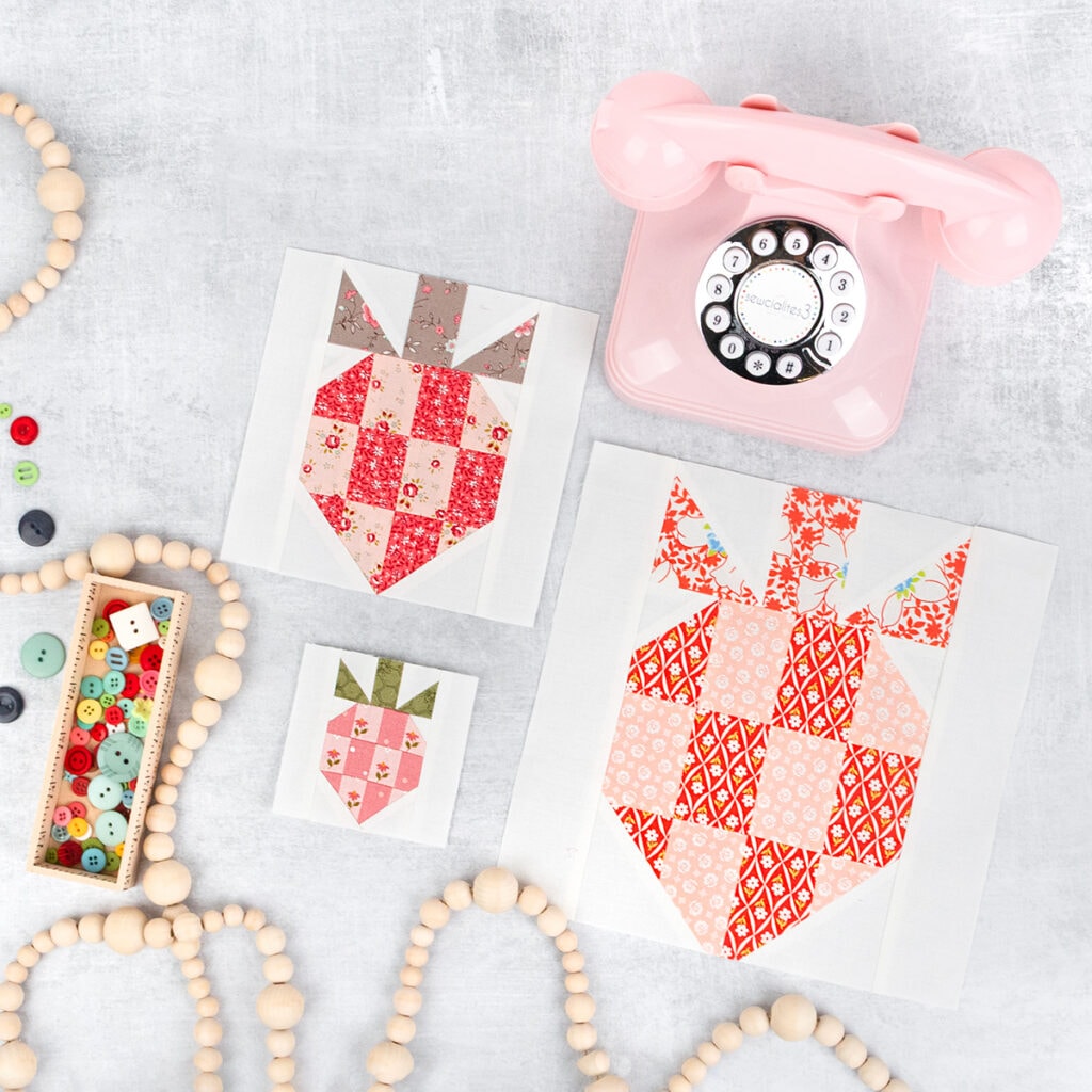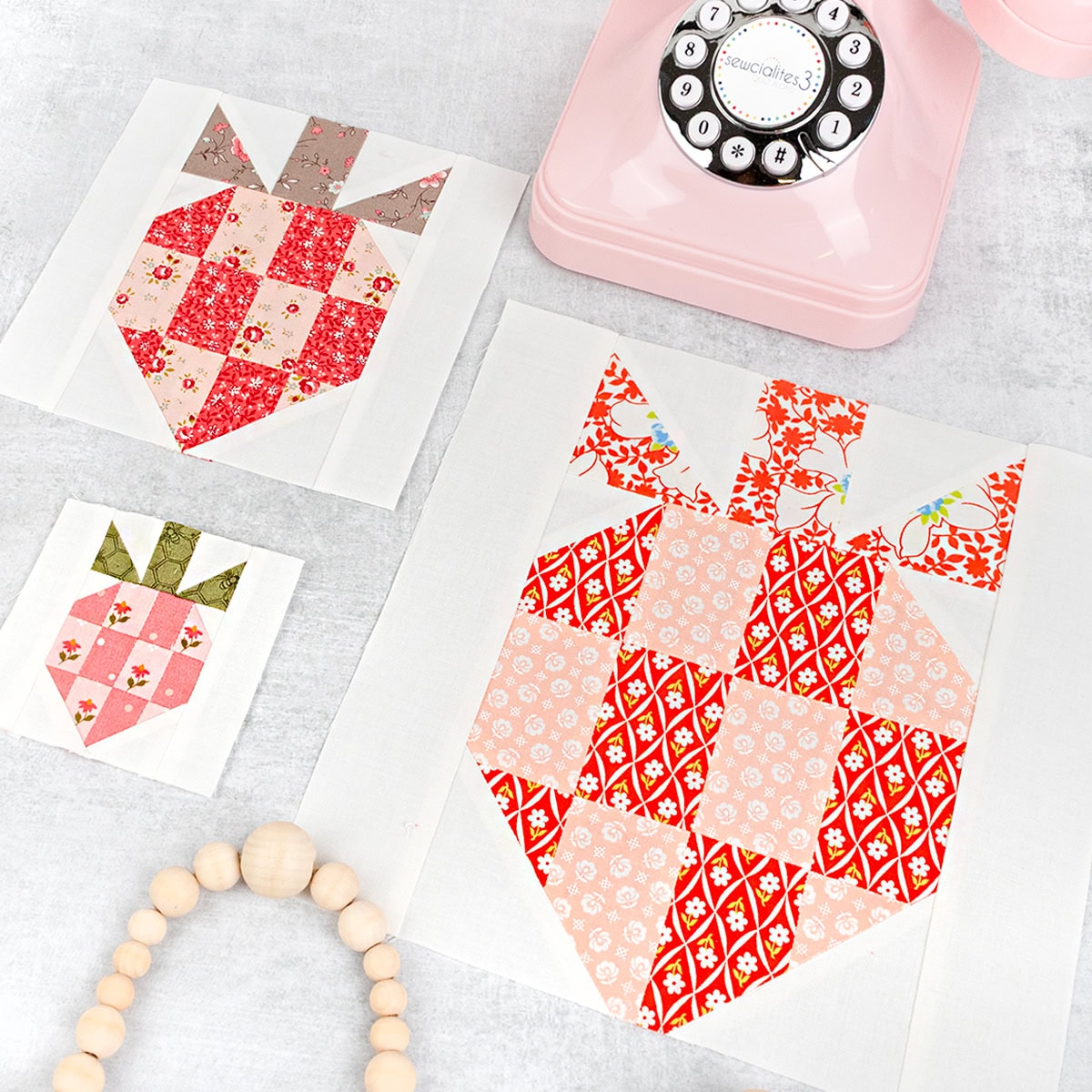 Take a look at the Little Berry Block in all three size options, using different collections! Kimberly sewed the 6″ block using Lyda Rose by Bunny Hill Designs for Moda Fabrics, Gina Tell (@gina_tell_threadgraffiti) made the 3″ block in Wild Honey by Lella Boutique for Moda Fabrics, and Pat Sloan (@quilterpatsloan) pieced her 9″ block with Rosie by Fig Tree Quilts for Moda Fabrics.