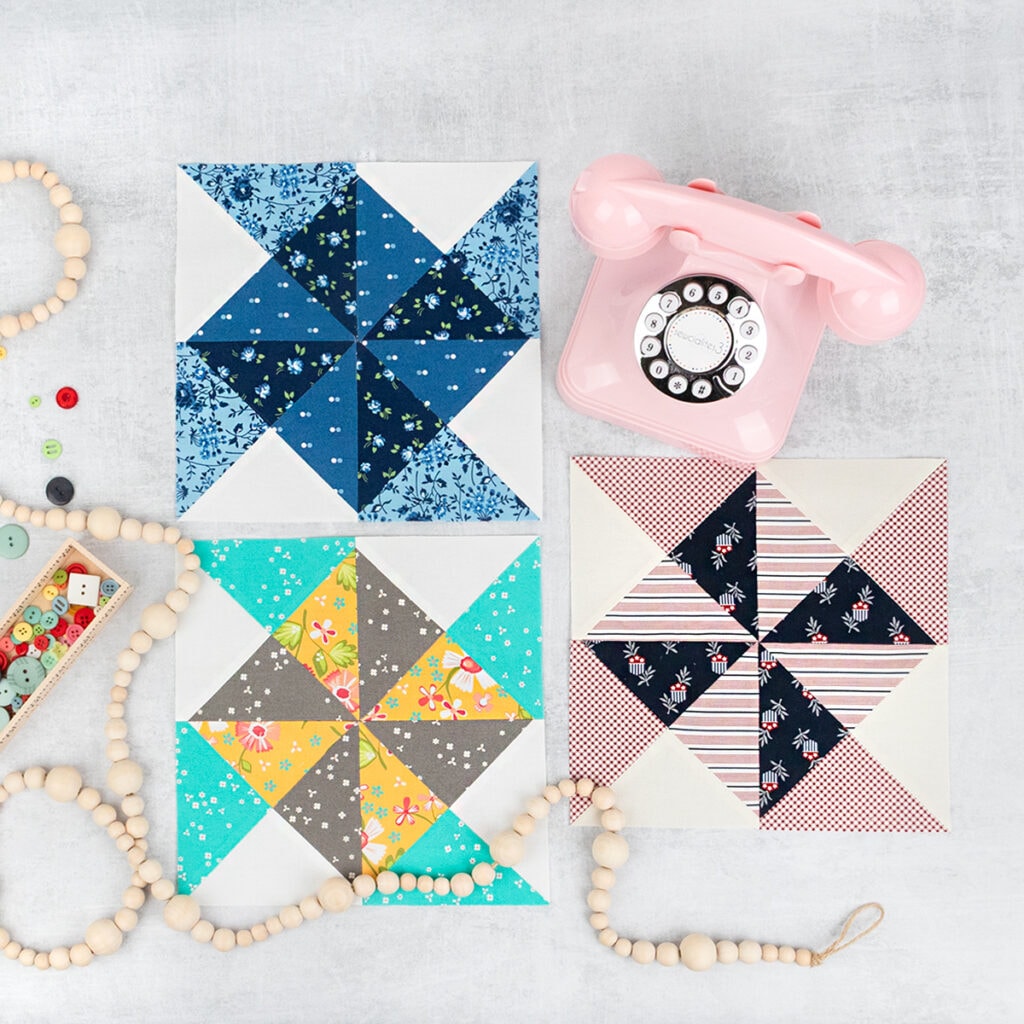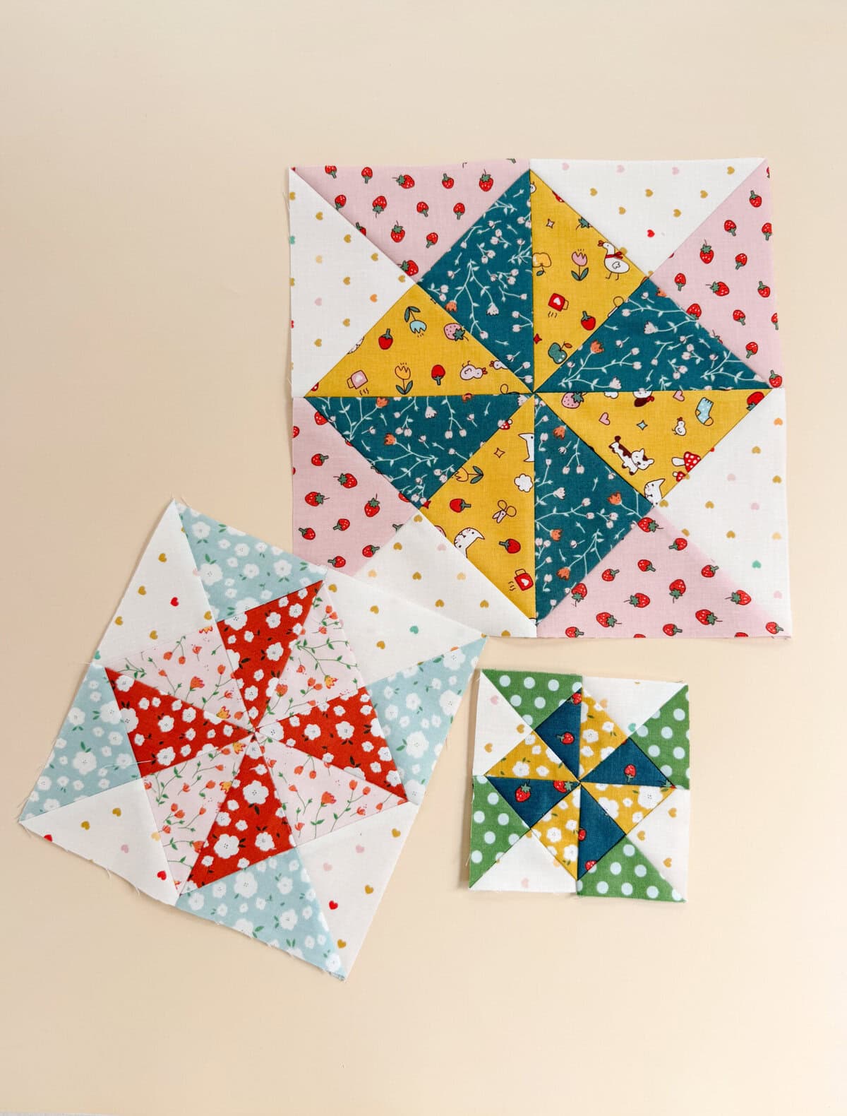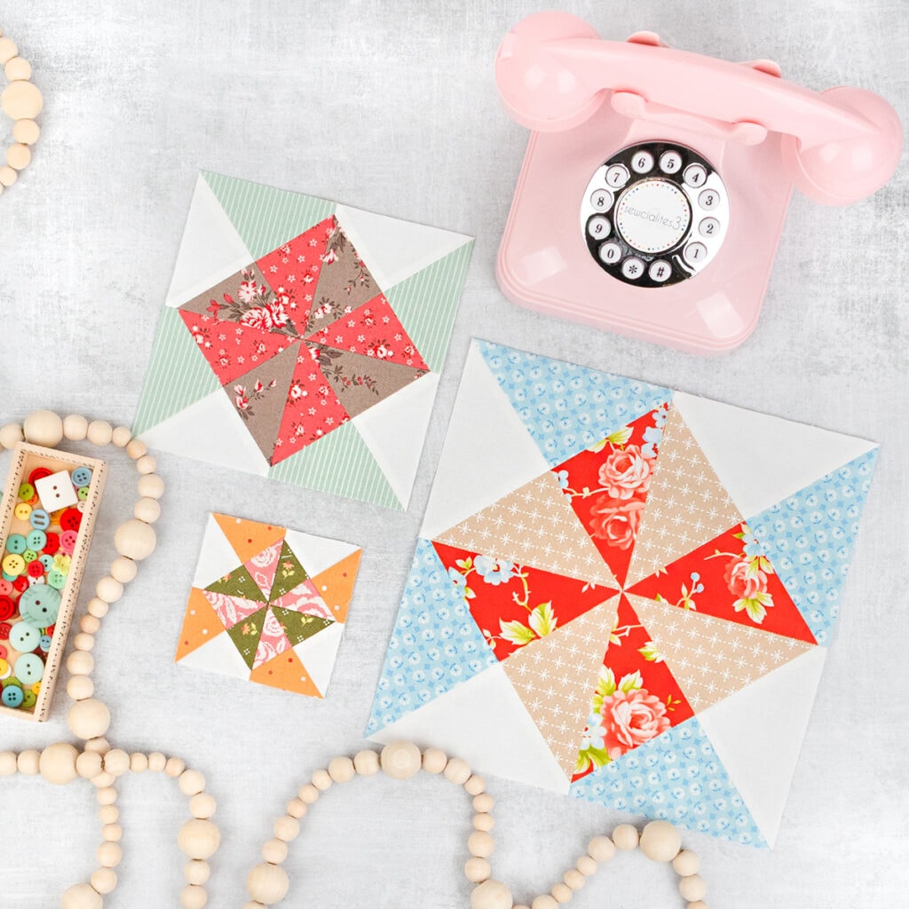 Take a look at the Spring Wind Block in all three size options, using different collections! Kimberly sewed the 6″ block using Lyda Rose by Bunny Hill Designs for Moda Fabrics, Gina Tell (@gina_tell_threadgraffiti) made the 3″ block in Wild Honey by Lella Boutique for Moda Fabrics, and Pat Sloan (@quilterpatsloan) pieced her 9″ block with Rosie by Fig Tree Quilts for Moda Fabrics.