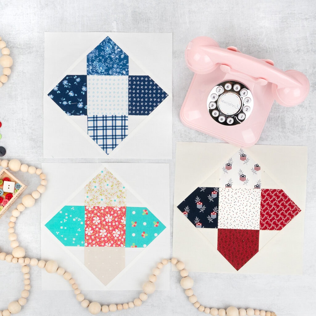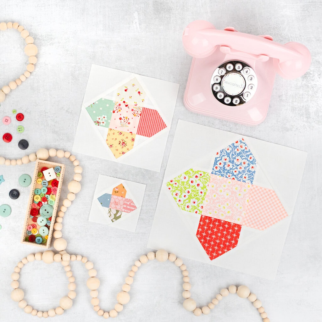 Take a look at the Daylight Block in all three size options, using different collections! Kimberly sewed the 6″ block using Lyda Rose by Bunny Hill Designs for Moda Fabrics, Gina Tell (@gina_tell_threadgraffiti) made the 3″ block in Wild Honey by Lella Boutique for Moda Fabrics, and Pat Sloan (@quilterpatsloan) pieced her 9″ block with Rosie by Fig Tree Quilts for Moda Fabrics.