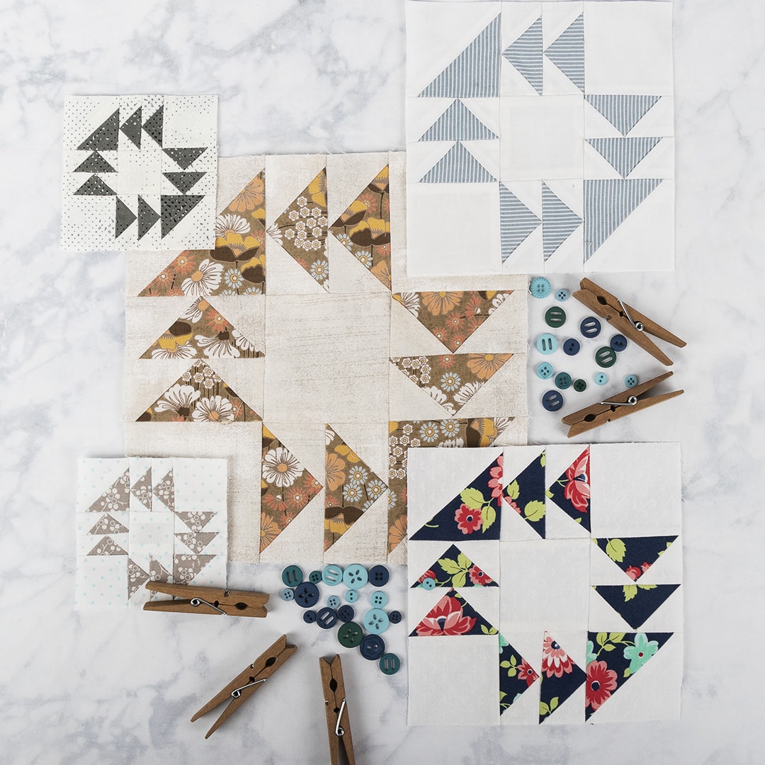 Kimberly is sewing with the Homestead collection by April Rosenthal for Moda Fabrics. She made her blocks in all three sizes for a fun challenge.