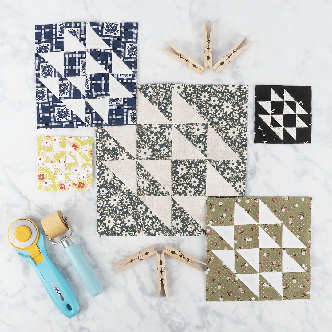 Kimberly is sewing with the Homestead collection by April Rosenthal for Moda Fabrics. She made her blocks in all three sizes for a fun challenge.