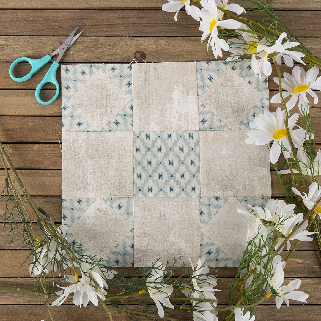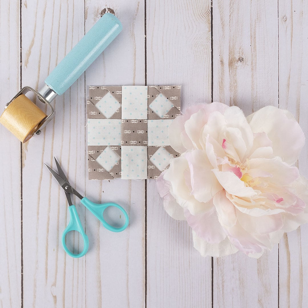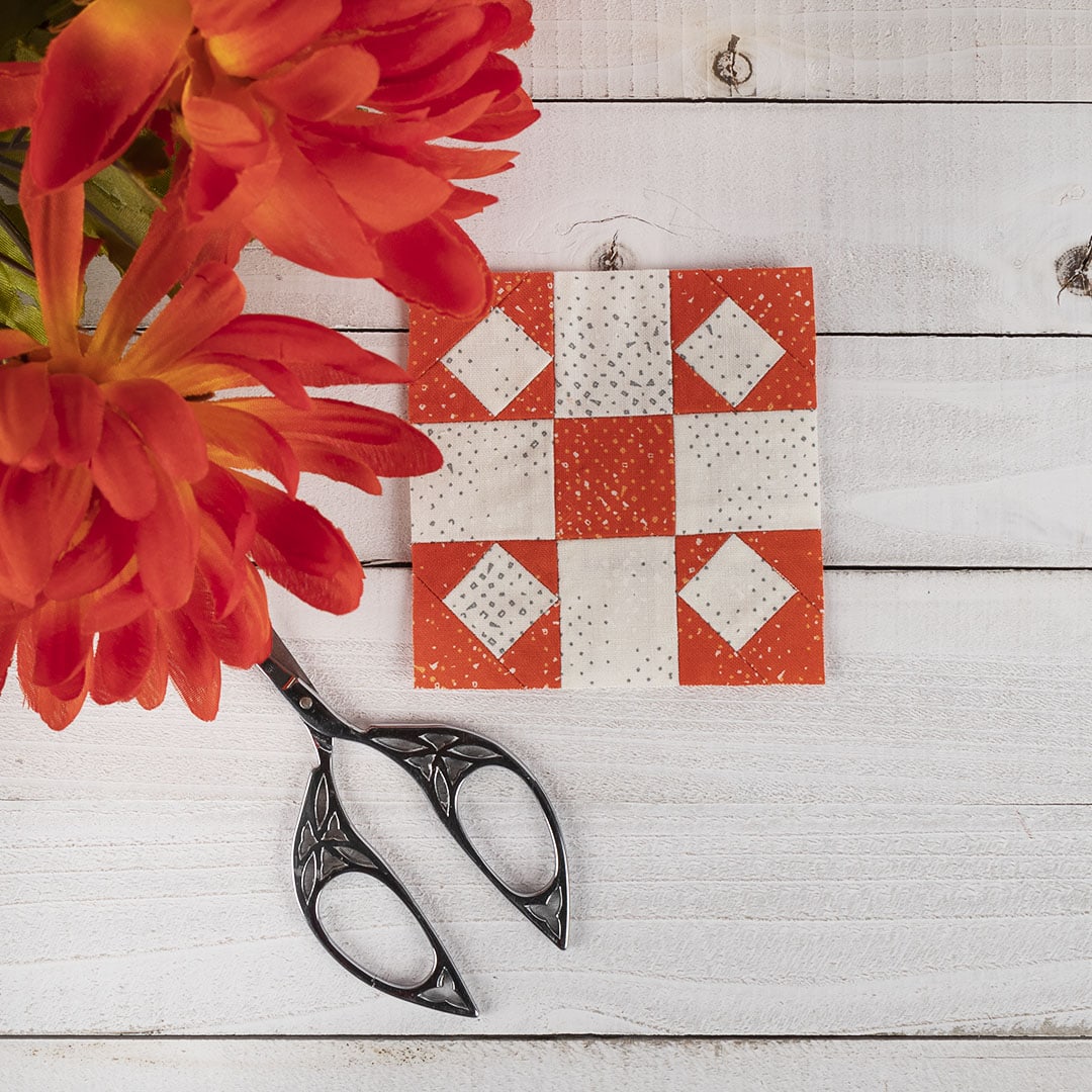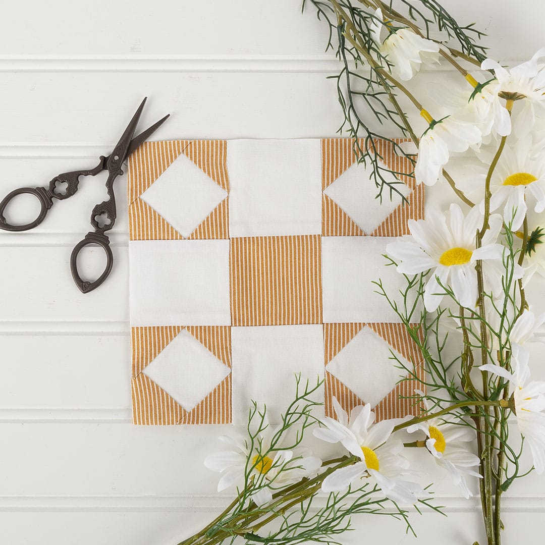 Camille sewed up her Gratitude block from her collection, Sunday Stroll. Her main sewing tip for us is to leave 1/4” past the points for the seam allowance when squaring up your square in square blocks!If you prefer to sew with foundation papers, the 2” and 3” Square in a Square Quilt Block Foundation Papers by It’s Sew Emma can be used for the 6” and 9” blocks, respectively.