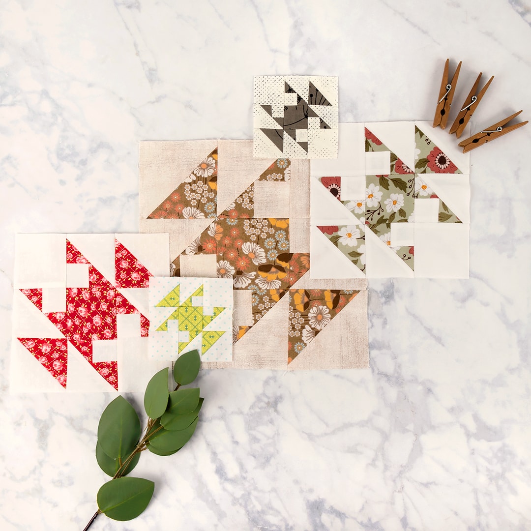 Kimberly is sewing with the Homestead collection by April Rosenthal for Moda Fabrics. She made her blocks in all three sizes for a fun challenge.