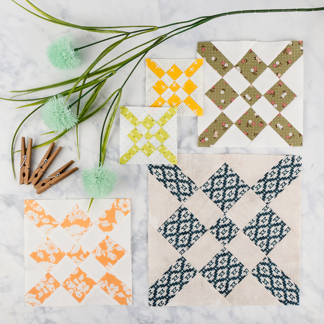 Kimberly is sewing with the Homestead collection by April Rosenthal for Moda Fabrics. She made her blocks in all three sizes for a fun challenge.