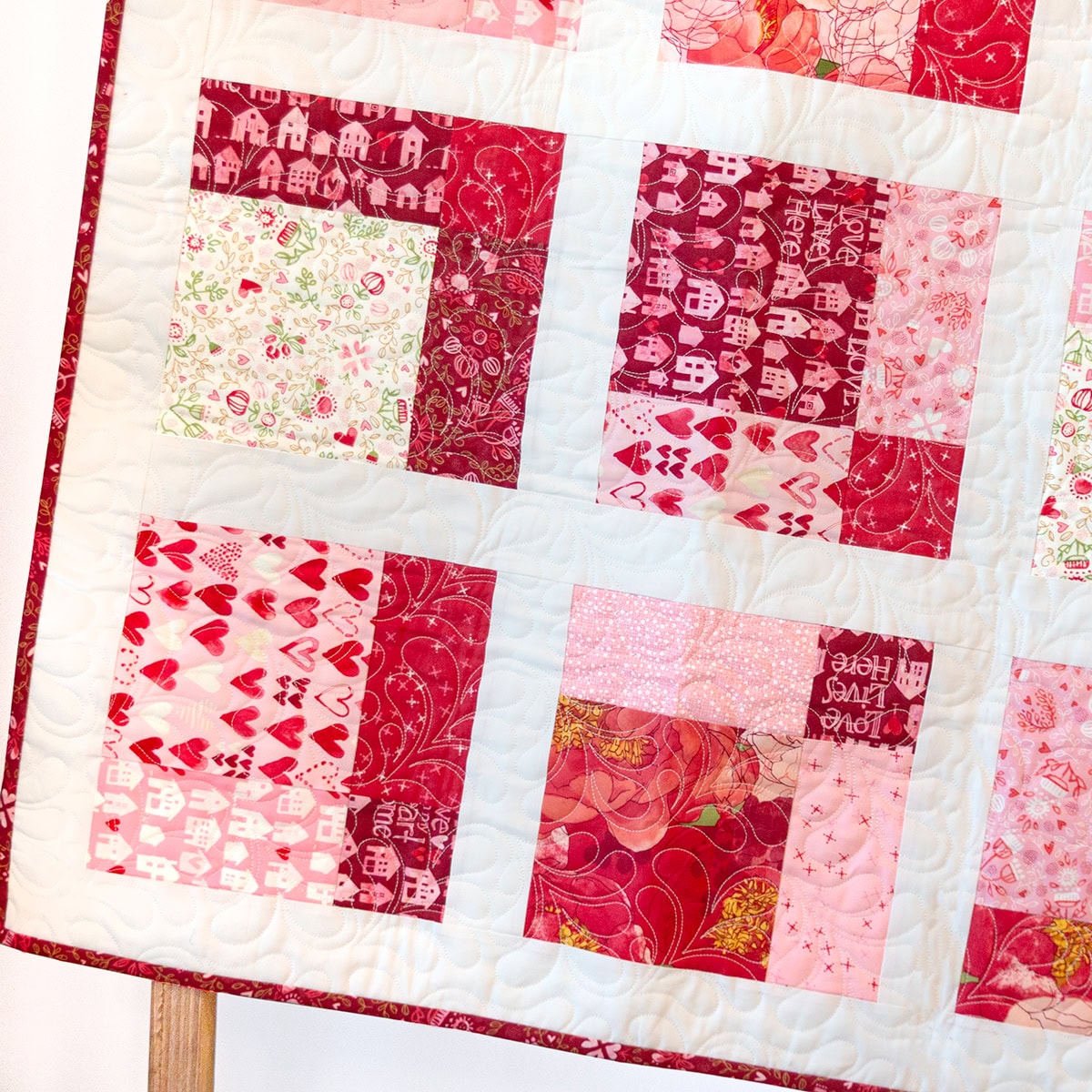 We sewed ours with Darling Peony by Robin Pickens for Moda Fabrics, and the background we chose is Bella Solids Off White (SKU #9900-200). The darling colors and lovely prints really shine in this quilt!