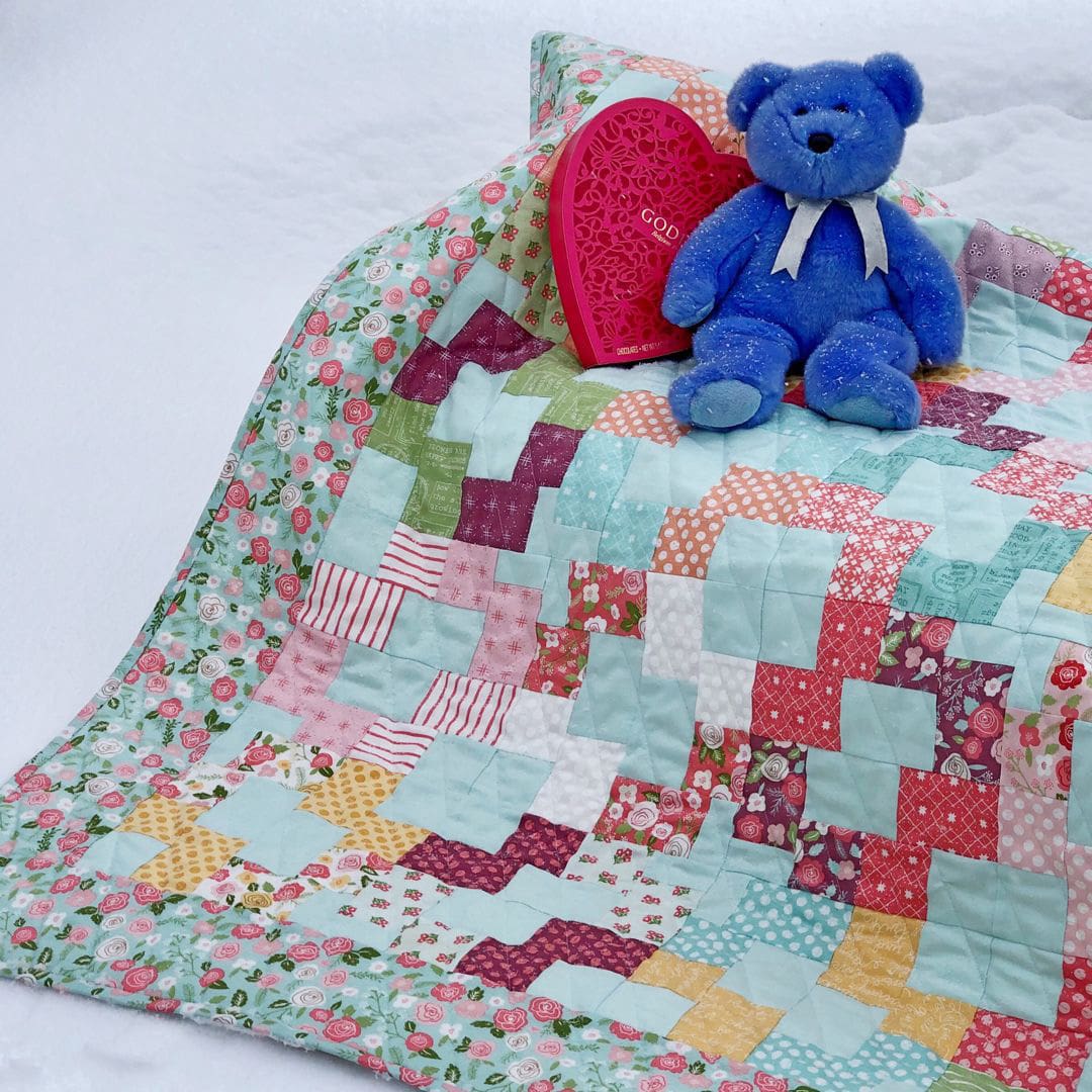 Jolly Bar Bakewell is a crib-sized quilt that would make the perfect gift for any new baby.