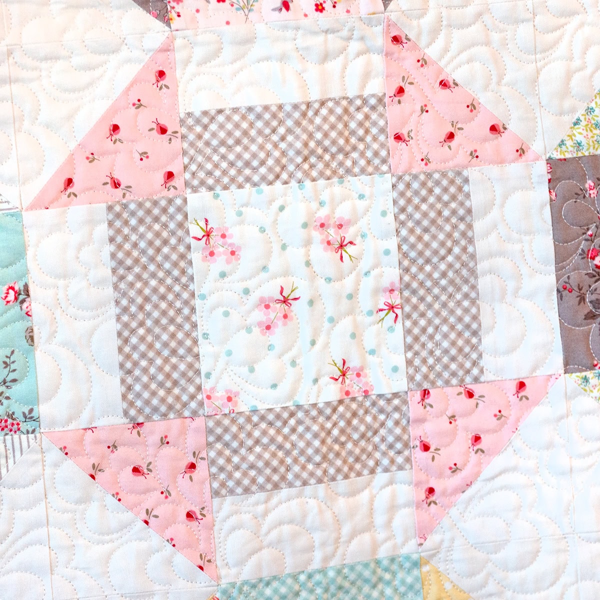 We sewed with Lyda Rose by Bunny Hill Designs for Moda Fabrics as our printed fabric, and the background we chose is Bella Solids Porcelain. The calming colors and fanciful florals are just as at home at a tea party as the sweet treat this quilt is named for!