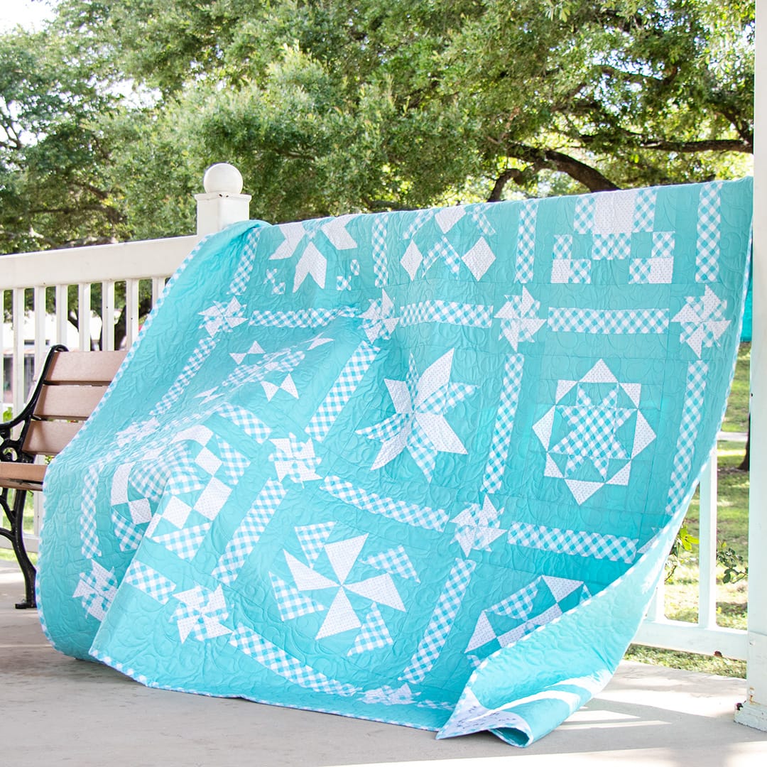 Kimberly made her Two Color Quilt in denim, and we have a Denim Two Color Sew Along Quilt Kit and matching Backing Set to make your own denim quilt. The Two Color Quilt can also be made in other colorways, such as aqua, pink, sea glass, green, red, nutmeg, yellow, or any other color. This quilt is perfect to display year-round!