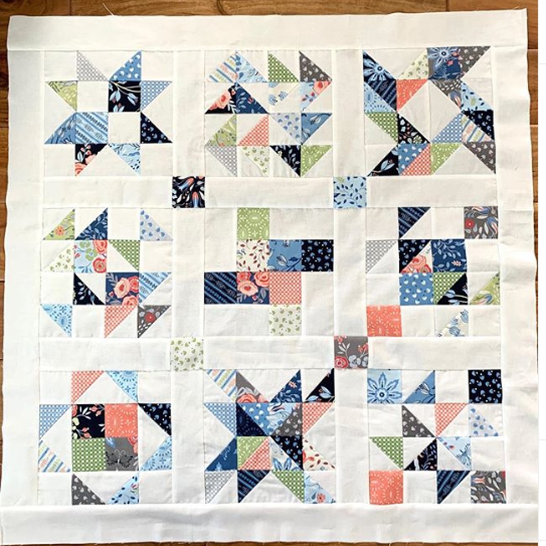 The Mini Wonder Quilt starts with 2.5” square Mini Charms, but it also works with Charm Packs, Jelly Rolls, Layer Cakes or yardage. The finished quilt makes a nice wall hanging or table topper.